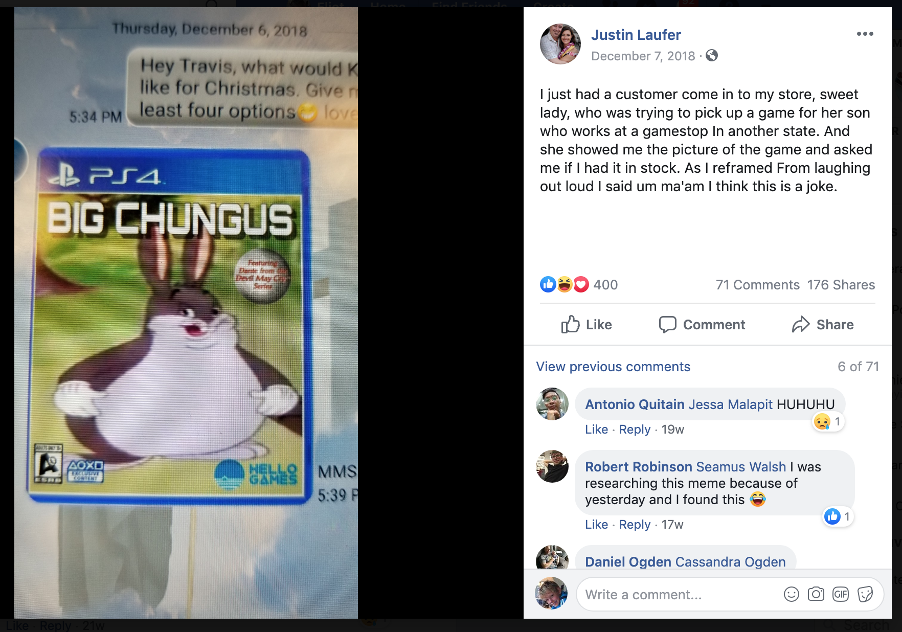 Big Chungus is the rabbit from Merrie Melodies cartoon “Wabbit Twouble“. After bugs bunny makes this position when mocking Elmer Fudd, who is more fat in this cartoon than others. This quickly spread into a meme when Redditor GaryTheTaco posted this image:
